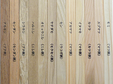 | あまり馴染みのない木ですが、建築、家具、庭木などで、私たちの身の回りでよく使われる日本の木12種のセットです。 |